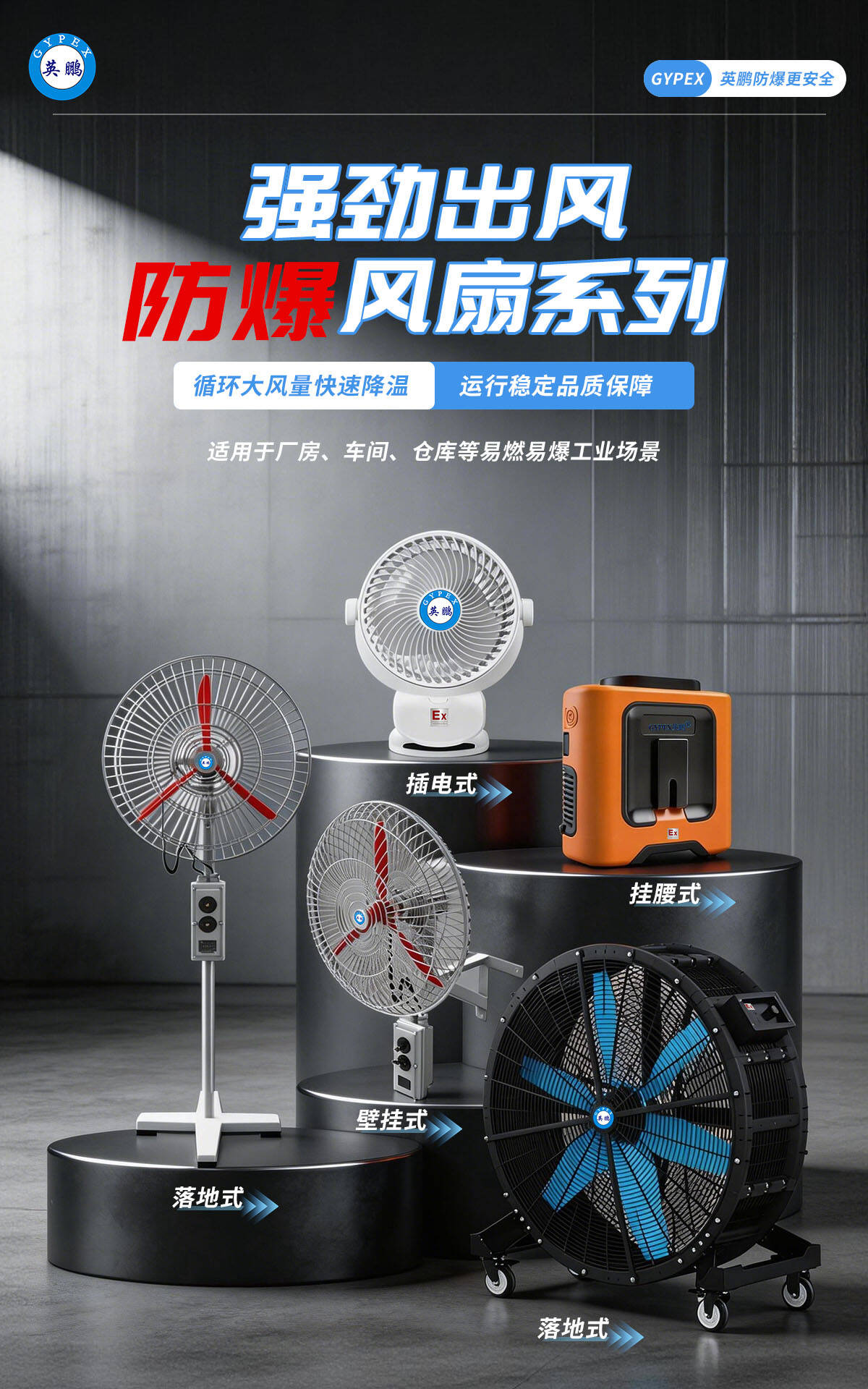 英鹏防爆风扇系列产品是专为存在爆炸性气体、蒸汽、粉尘或易燃易爆物质的危险场所设计的通风降温设备。产品严格遵循国家防爆电气标准,通过隔爆型、增安型等复合防爆技术,确保设备在运行过程中不成为点燃源,为危险环境提供安全、可靠、高效的通风。